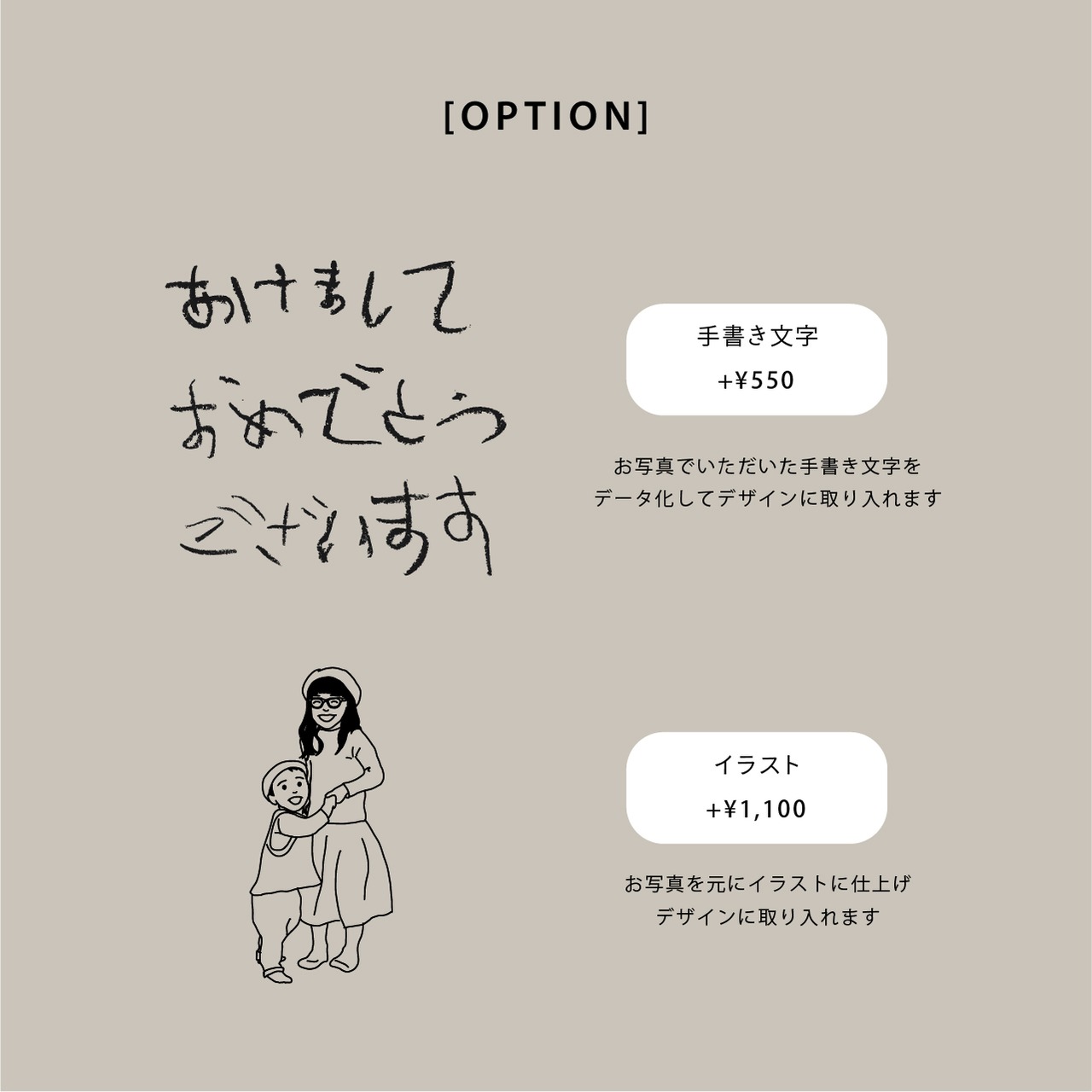 お好きなご家族のお写真を元にイラストを描き、デザインにお入れします。